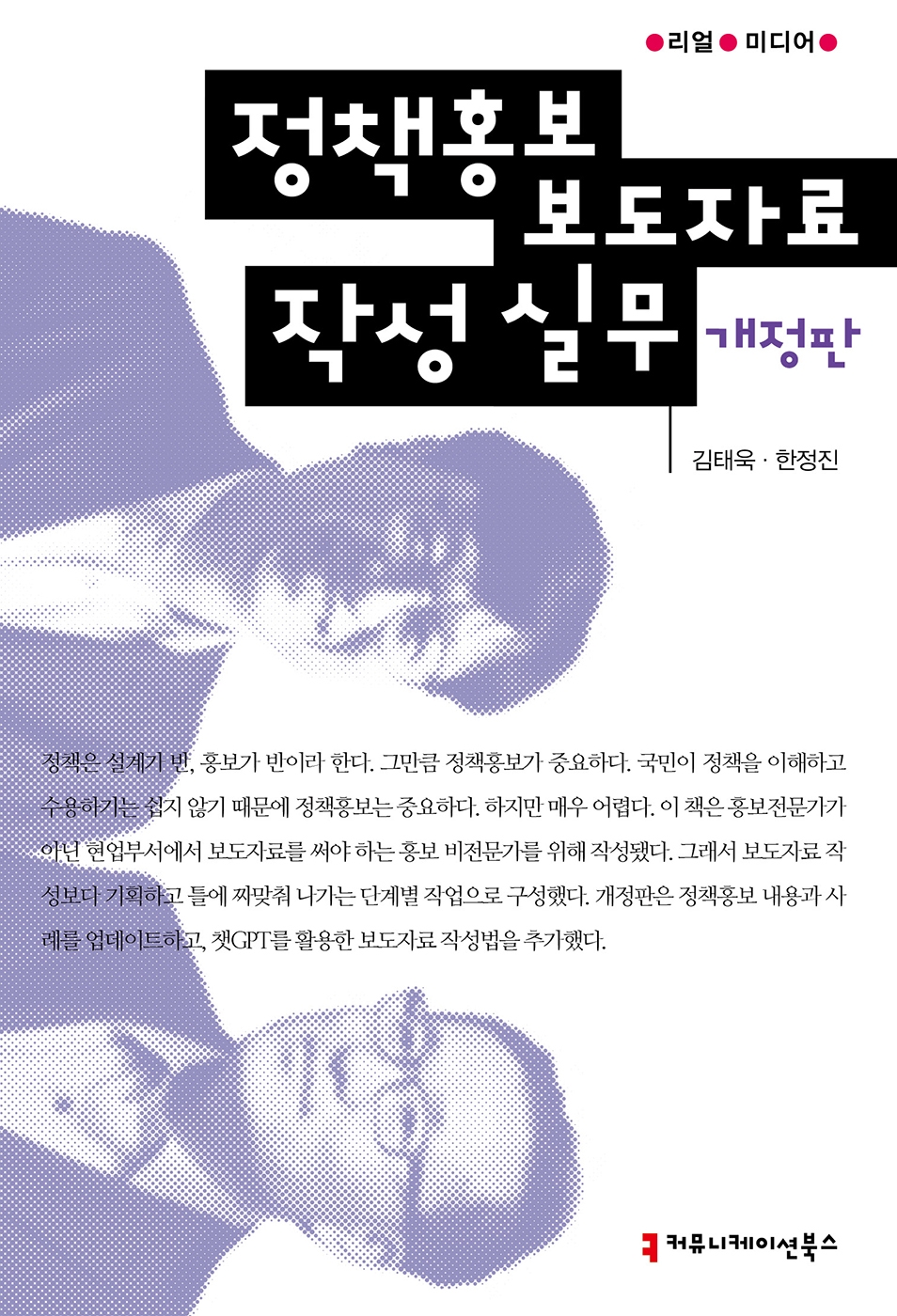 정책 성공은 ‘설계가 반, 홍보가 반’이다. 아무리 좋은 정책이라도 국민과 정책 이용자에게 홍보가 제대로 되지 않으면 성공하기 힘들다. 이 책은 홍보전문가가 아닌 현업부서에서 보도자료를 써야 하는 홍보 비전문가를 위해 작성됐다. 그래서 보도자료 작성보다는 기획하고 틀에 짜맞춰 나가는 단계별 작업으로 구성했다. 개정판은 정책홍보 내용과 사례를 업데이트하고, 챗GPT를 활용한 보도자료 작성법을 추가했다. 현장 실무 교육 기법과 실무 사례와 예시가 풍부해 현장 경험이 부족한 초보자에게 특히 유용하다.