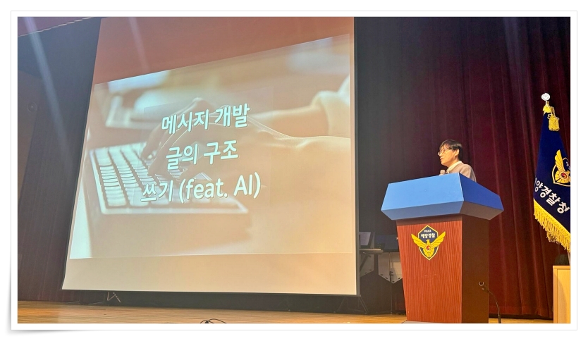 인천시 연수구에 있는 해양경찰청에서 강의했다. "AI를 활용한 보도자료 작성" 주제로 100여 명 임직원 대상으로 진행한 90분 특강이다.